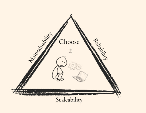 Here’s some of what I’ve seen happen to the most well-meaning development teams. As they work under tight deadlines and pressure to deliver, they often find themselves balancing competing priorities, such as maintainability, scalability, and reliability—what can be thought of as the triangle of software development.